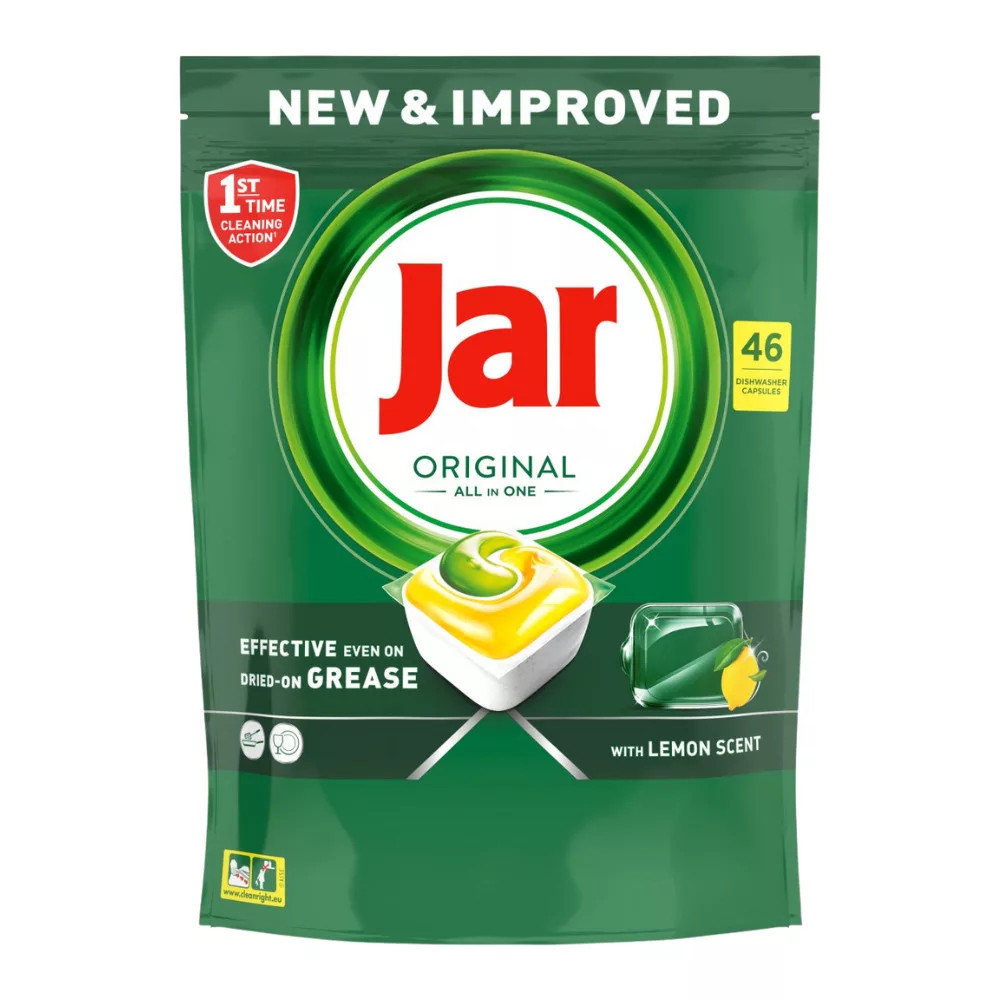 A nagy múltú Jar szakértelmével megalkotott Original All in One mosogatókapszula kompromisszumok nélküli tisztaságot hoz a konyhádba. A rendkívül gyorsan oldódó formula szinte azonnal kifejti hatását, így még rövidebb mosogatási ciklusok esetén is tökéletes és gyors eredményt nyújt a makacs zsírfoltok vagy a rászáradt ételmaradékok ellen. Használata pofonegyszerű: a fóliát nem kell kicsomagolni vagy kiszúrni, száraz kézzel egyszerűen csak helyezd a mosogatógép adagolójába. A kapszula beépített só- és öblítőfunkciója a legtöbb háztartásban (26°e vízkeménységig) tökéletesen elegendő az optimális működéshez, még akkor is, ha a gép hiányt jelző fényei világítanak.