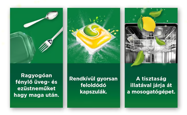 -Kettős tisztítóerő: Egyetlen kompakt kapszulában ötvözi a folyékony és a por állagú mosogatószerek rendkívüli zsíroldó képességét.