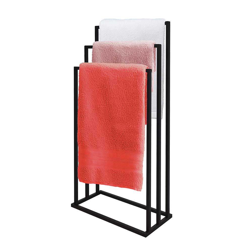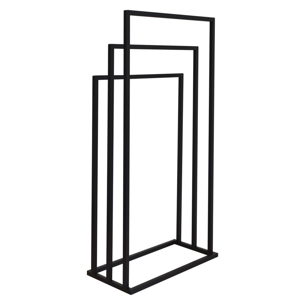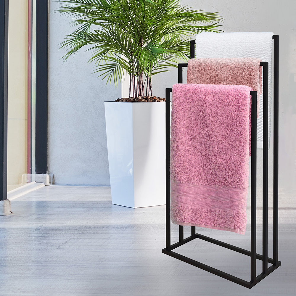 Varázsolj eleganciát és rendet a fürdőszobádba ezzel a prémium minőségű törölközőtartó állvánnyal! A modern, letisztult dizájn tökéletesen ötvözi az esztétikát a mindennapi praktikummal, így klasszikus és indusztriális (loft) enteriőrökbe egyaránt nagyszerűen illeszkedik. A stabil, porszórt acél váz ellenáll a fürdőszobai párának és nedvességnek, garantálva a hosszú élettartamot. A három, lépcsőzetesen elhelyezett tartókar (86 cm, 76 cm és 66 cm) optimális légáramlást biztosít, ami jelentősen felgyorsítja a nedves törölközők száradási idejét. Hatalmas előnye, hogy megkímél a fúrástól és a barkácsolástól: az állvány teljesen összeszerelve érkezik, így azonnal a kívánt helyre állítható.