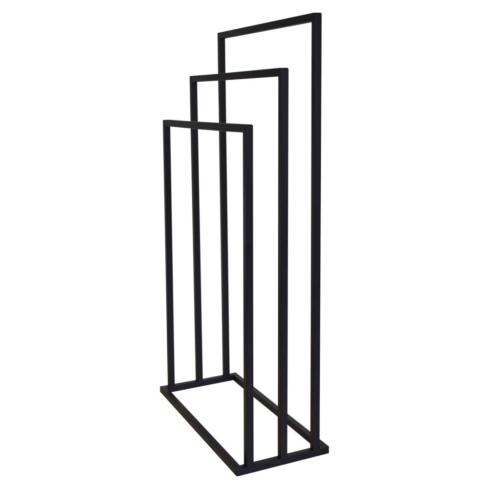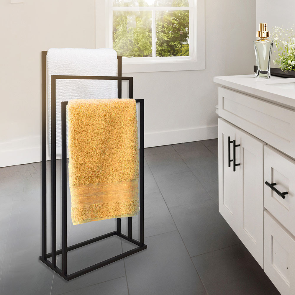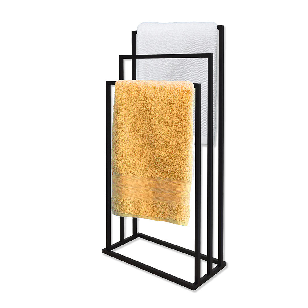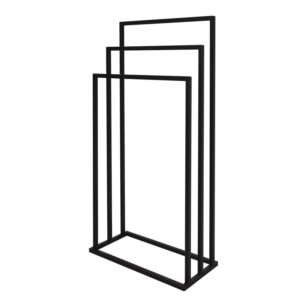 Varázsolj eleganciát és rendet a fürdőszobádba ezzel a prémium minőségű törölközőtartó állvánnyal! A modern, letisztult dizájn tökéletesen ötvözi az esztétikát a mindennapi praktikummal, így klasszikus és indusztriális (loft) enteriőrökbe egyaránt nagyszerűen illeszkedik. A stabil, porszórt acél váz ellenáll a fürdőszobai párának és nedvességnek, garantálva a hosszú élettartamot. A három, lépcsőzetesen elhelyezett tartókar (86 cm, 76 cm és 66 cm) optimális légáramlást biztosít, ami jelentősen felgyorsítja a nedves törölközők száradási idejét. Hatalmas előnye, hogy megkímél a fúrástól és a barkácsolástól: az állvány teljesen összeszerelve érkezik, így azonnal a kívánt helyre állítható.