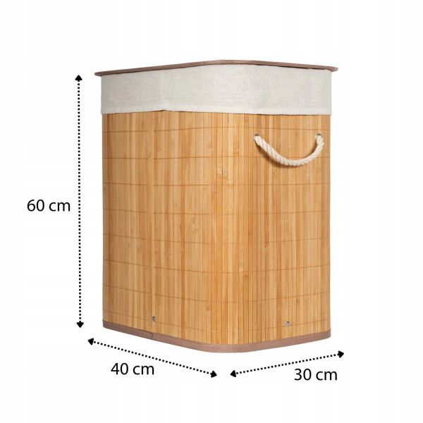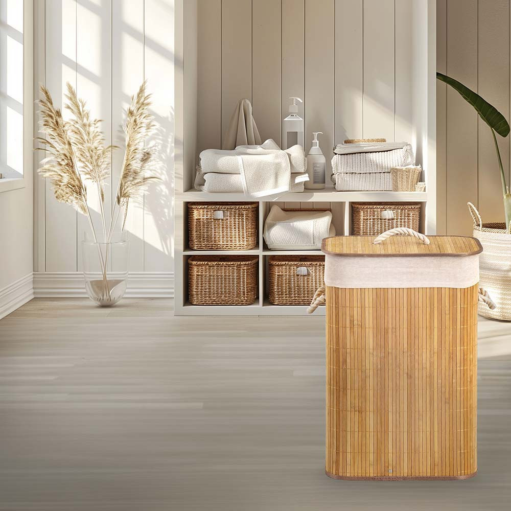 A 72 literes kapacitású Sepio Bamboo összecsukható szennyestartó praktikus és esztétikus megoldás a mindennapi ruhatárolásra. A természetes bambuszból készült kosár kivehető, poliészter szövetbetéttel, vastag kötélfogantyúkkal és praktikus fedéllel rendelkezik. Könnyű, mindössze 1,4 kg-os súlya révén egyszerűen mozgatható, összecsukható funkciója pedig helytakarékos tárolást tesz lehetővé, miközben meleg, természetes hangulatot visz a fürdőszobába.