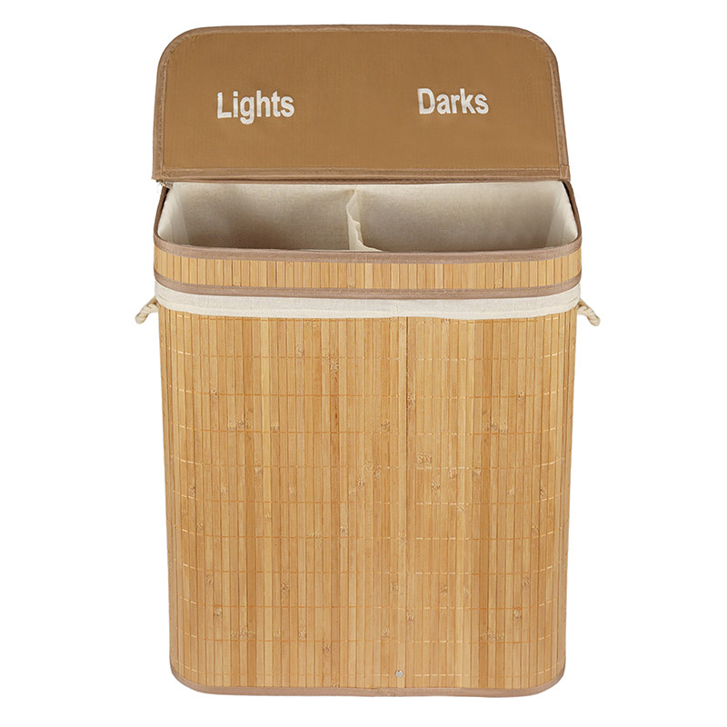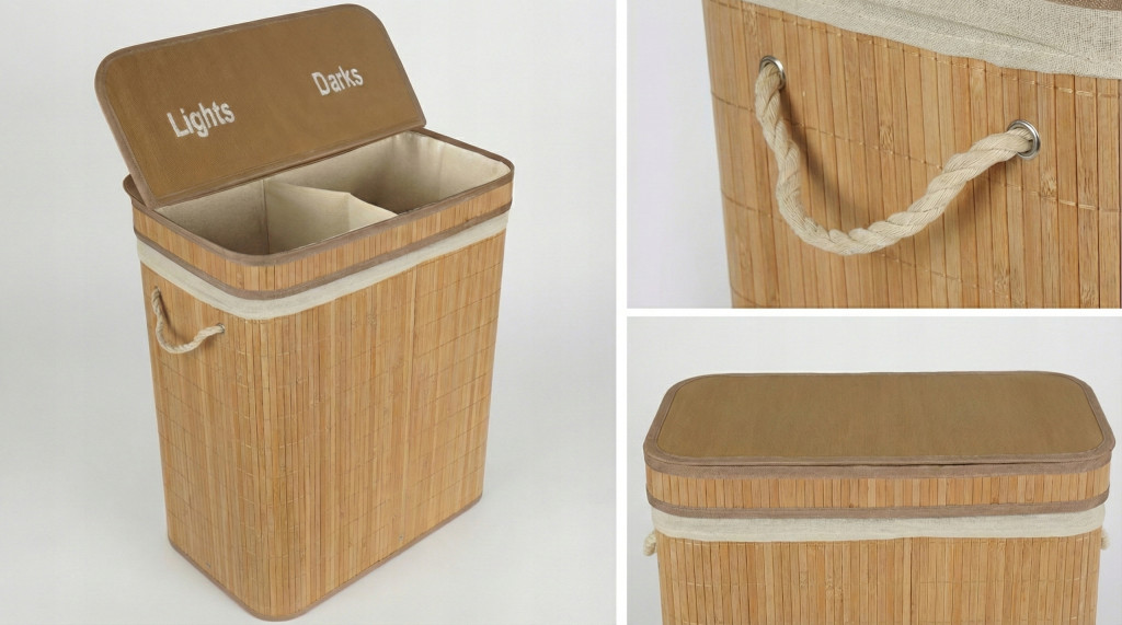 A 105 literes kapacitású, kétrekeszes bambusz szennyestartó praktikus és esztétikus megoldás a ruhák egyszerű szelektálására. A természetes bambuszból készült kosár kivehető pamut betéttel, vastag kötélfogantyúkkal és praktikus fedéllel rendelkezik. Összecsukható funkciója helytakarékos tárolást tesz lehetővé, miközben a két különálló rekesz (világos és sötét ruhák számára) azonnal megkönnyíti a mosás előkészítését.